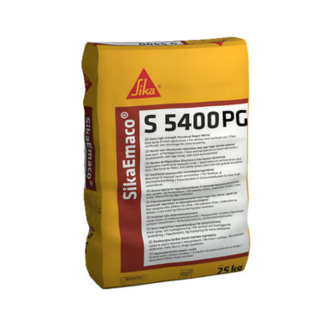 SikaEmaco® S 5450 PG is a one-component, high strength, high modulus and shrinkage compensated concrete repair mortar that meets the requirements of Class R4 according to EN 1504-3. SikaEmaco® S 5450 PG is a ready-to-use material that contains sulphate resistant Portland cement (HSR LA), hydraulic binders, well graded sands, selected polymer fibres (polyacrylonitryl or PAN) and special additives to significantly reduce the risk and incidence of shrinkage cracking. When mixed with water, SikaEmaco® S 5450 PG forms a mortar with a fluid or flowable consistency which can be easily applied by hand or machine. SikaEmaco® S 5450 PG can be used in thickness from 20 mm up to 200 mm.