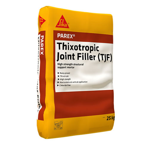 A pumped mortar purpose-designed for filling joints and gaps in precast concrete units without the need for formwork. The thixotropic qualities of the mortar and non-shrink additives allow it to stay in place without slumping and to provide a complete high strength bond between sections. Before forming an initial set, it can be tooled off to provide a complete and smooth joint. The material can be used for placing in horizontal and vertical gaps of 5mm to 100mm where a cementitious mortar infill is required and flow grouting is inappropriate. It requires only the addition of water on site and is mixed using a drill and paddle followed by hand or mechanical pump placement. For larger jobs mixer pumps can be used. Parex Thixotropic Joint Filler (TJF) is chloride-free and can be safely used in contact with steel reinforcement.