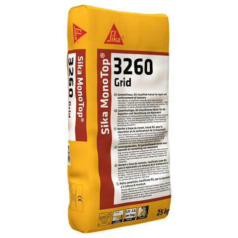 Sika MonoTop®-3260 Grid is a one-part, cementitious fibre reinforced surface / finishing mortar. It is designed to be used in combination with the Sika® CarboDur®-300 Grid as part of the Sika® CarboDur® Grid System, which provides an efficient solution to consolidate and strengthen masonry.