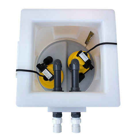 The system consists of a polyethylene sump chamber with locking access cover (pedestrian traffic only), two 240V, automatic submersible pumps and a separate high level alarm unit.