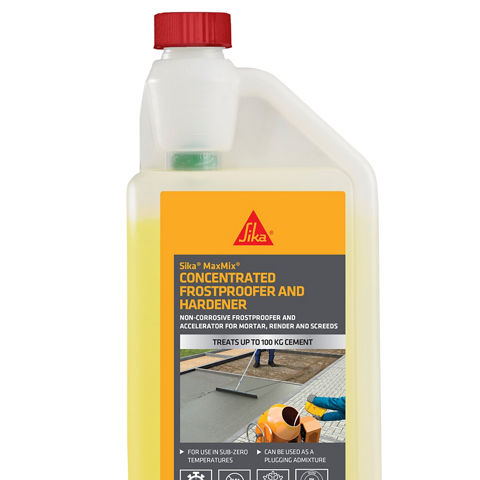 Sika MaxMix® Concentrated Frostproofer and Hardener is a highly concentrated, chloride free, air entraining admix which is designed specifically for cold weather working, eliminating the requirement for a second frostproofing admix. It reduces the setting time of sand and cement based mortars, renders, screeds etc and is the ideal choice for a cold weather admix providing frost protection below –4 °C. Being chloride free, it will not attack embedded steel and hence is suitable for use with brick ties etc.