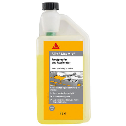 Sika MaxMix® Frostproofer is a highly concentrated, chloride free, air entraining admix which is designed specifically for cold weather working, eliminating the requirement for a second frostproofing admix. Sika MaxMix® Frostproofer reduces the setting time of sand and cement based mortars, renders, screeds etc and is the ideal choice for a cold weather admix providing frost protection below –4 °C. Being chloride free, Sika MaxMix® Frostproofer will not attack embedded steel and hence is suitable for use with brick ties etc.