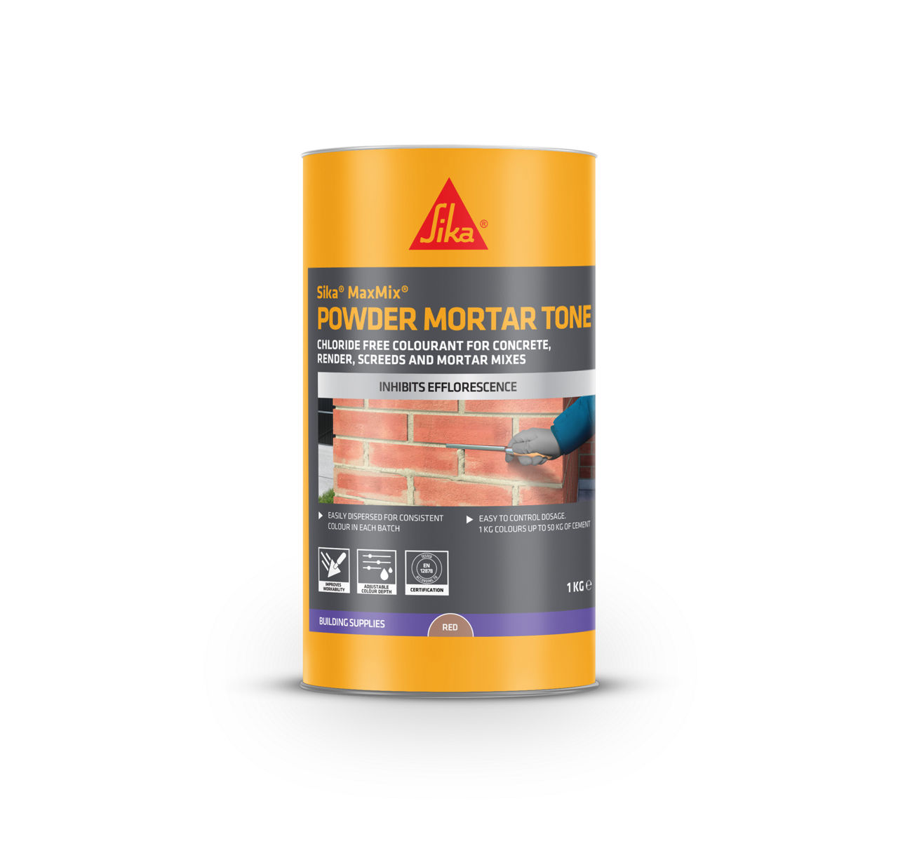 Sika® MaxMix® Powder Mortar Tone is a range of powdered oxide pigments which can be accurately measured to colour concrete, render, screeds, mortar etc. The pigments disperse easily into the mix to give a uniform shade for each mix batch, dose can be adjusted to provide a wider variety of colour depths.
