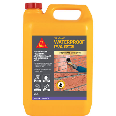 SikaBond® Waterproof PVA Ultra is a waterproof vinyl acetate polymer especially formulated for exterior use as an adhesive and sealer. Suitable for brickwork, mortar, render, screed and plaster. It is easy to use and unlike normal PVA it will not re-emulsify when wet.