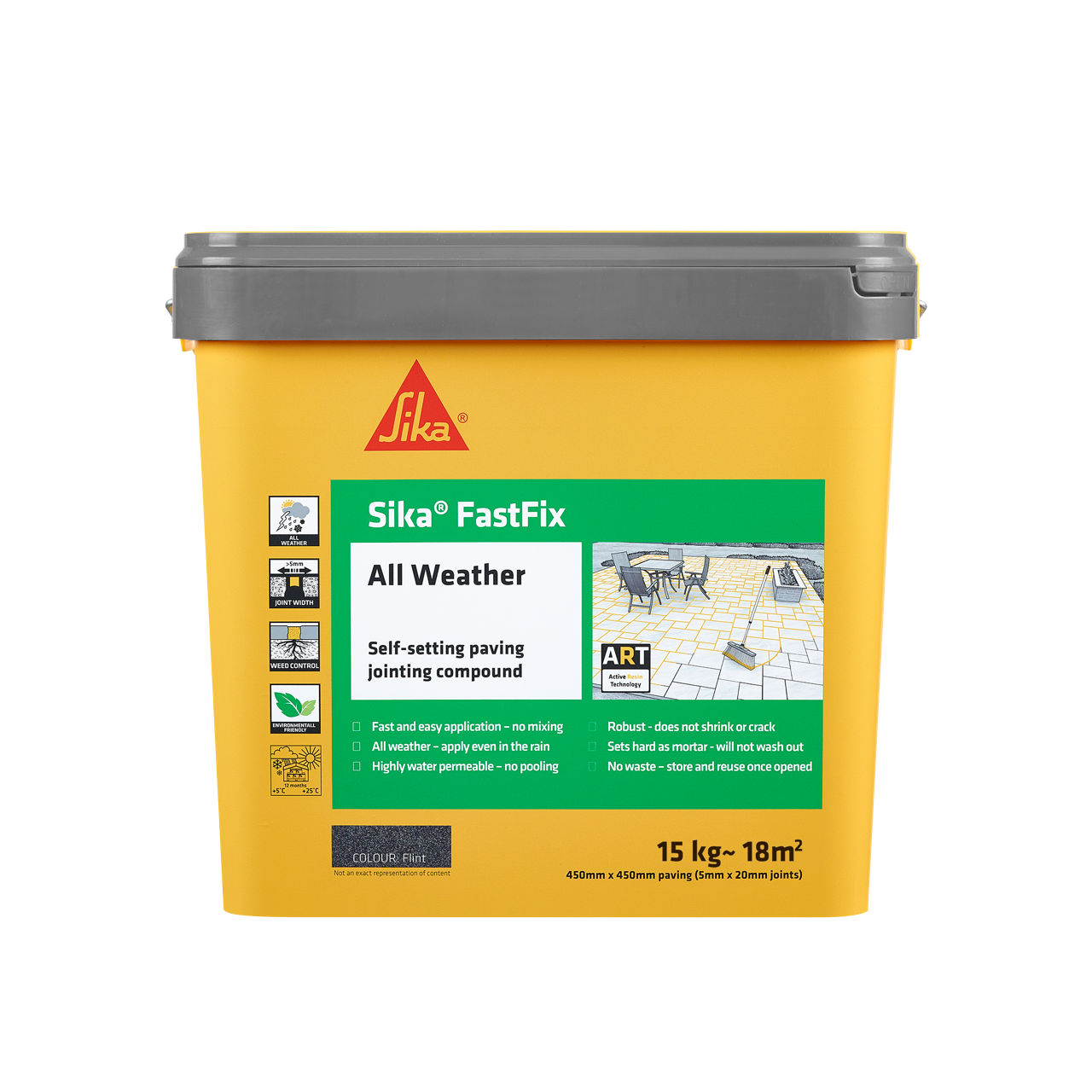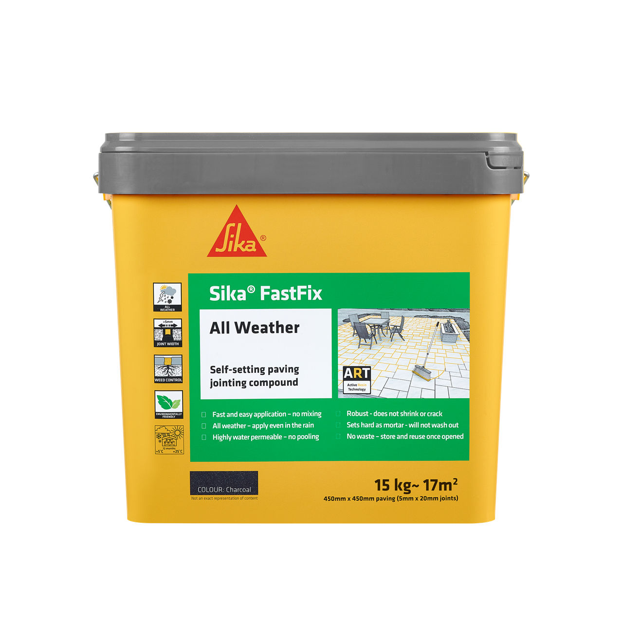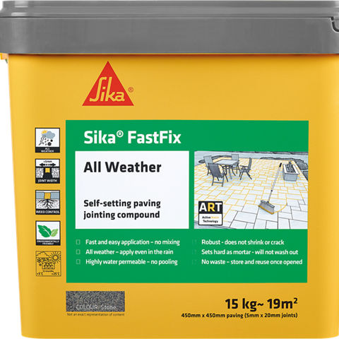 Sika FastFix® All Weather is a ready to use, self-setting paving jointing compound with Active Resin Technology for advanced durability. It sets hard and will not wash out, while still remaining water permeable. Sika FastFix® All Weather is perfect for outdoor patios, pavements and paths with joints over 5 mm wide and 20 mm deep. Fast and easy to use, it can be applied in any weather conditions even in the rain. Sika FastFix® All Weather can also be stored and reused after opening to reduce waste.