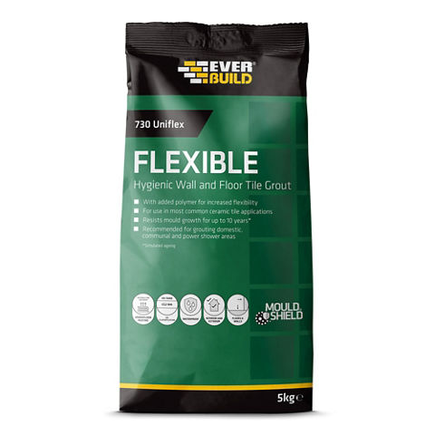 5 kg EVERBUILD® 730 Universal Flexible Grout is a cementitious grout designed specifically for wall and floor tile applications for joints up to 15 mm wide. The added powder polymer in EVERBUILD® 730 Universal Flexible Grout provides flexibility and water resistance to give a durable water repellent finish. Suitable for most common tiles including ceramic, natural stone and porcelain. EVERBUILD® 730 Universal Flexible Grout contains MouldShield® for long lasting anti-fungal protection against black mould.