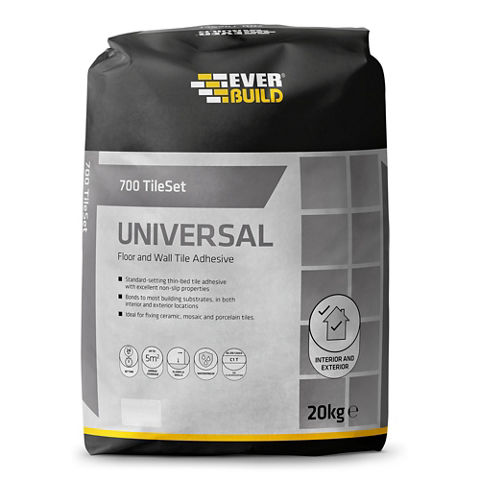 TileSet 700 Universal is a standard-setting universal floor and wall tile adhesive for bonding ceramic, porcelain and mosaic tiles to most building substrates in both interior and exterior locations, where extended opening time is required.